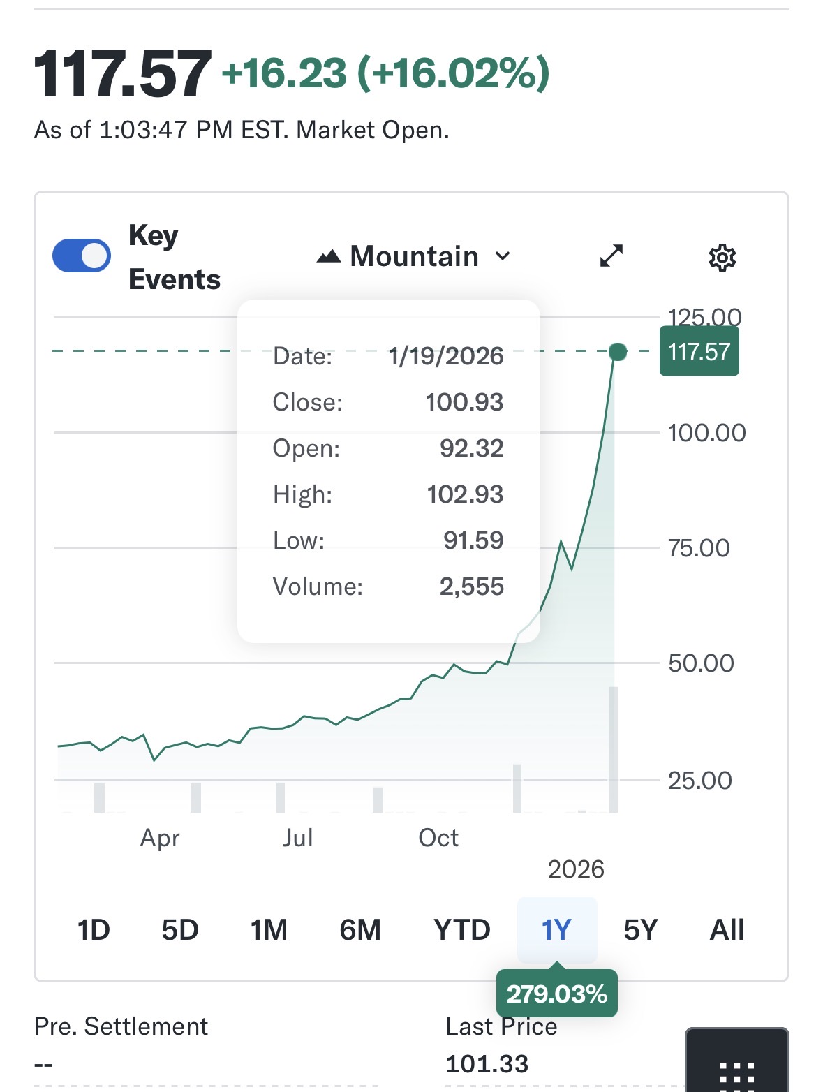 Normalt er vi raske med å oppdatere når prisen stiger, men etter dagens 11 % oppgang – og et par flasker Dom Pérignon 1988 – er pulsen høy og tastaturet litt tregere