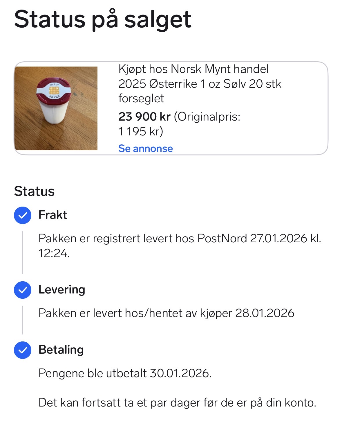 fikk siste kronene inn på konto i går fra fond og i dag fikk jeg beskjed om at 24k på vei fra ett salg på 20 Philharmonica mynter…