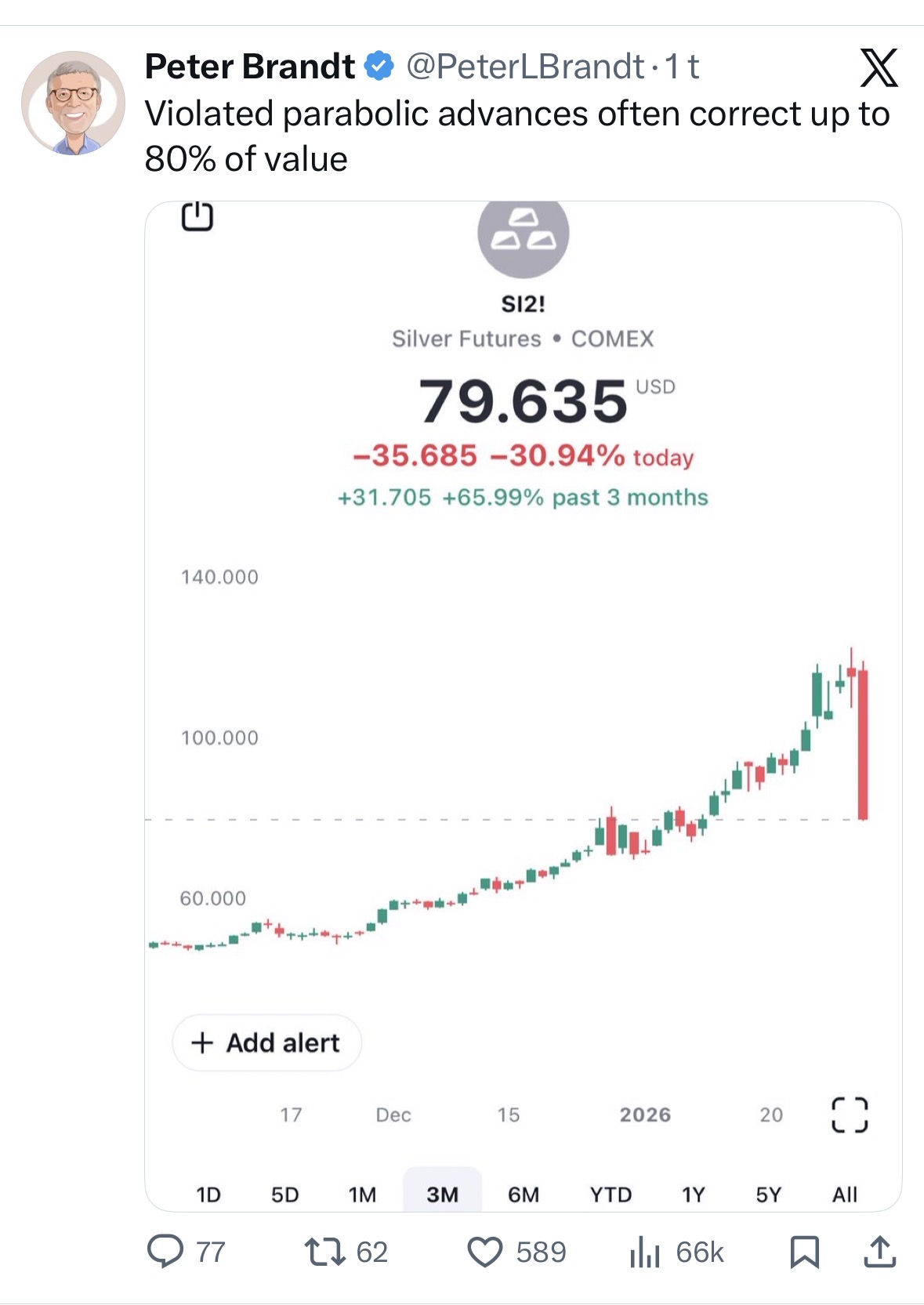 2.Med dagens klima og ekstrem gearing gjør at vi går rett til himmels, og så ned igjen og så opp/ned… Dette blir den "bitcoin " traderen. Sølv er lite marked lett og manipulere kan gå rett opp og så rett ned flere ganger.