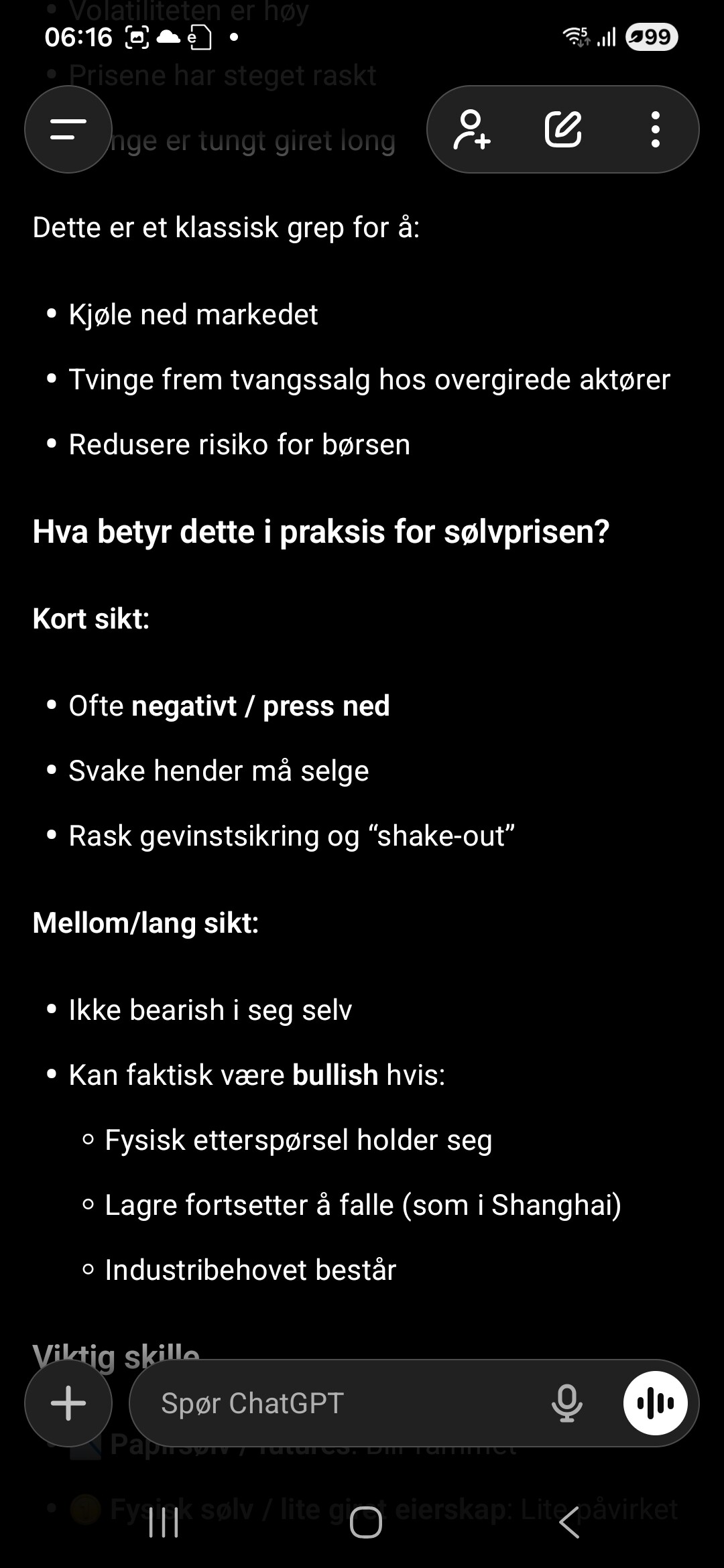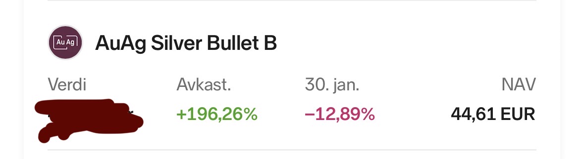 Jeg har nesten halve pensjonen min i silver bullet, så får jaggu håpe det går bedre enn dette. Når jeg hadde fått 100k opp på avkastning, så skulle jaggu fruen inn i starten av forrige uke. Sa til hun at det kanskje er smart å vente noen uker for det har gått så inn i granskauen. Hun var tatt av FOMO, var ikke til å stoppe, gikk inn og nå gikk det til dunders. Må le litt av det, hehe. Jeg er på null og hun i minus…