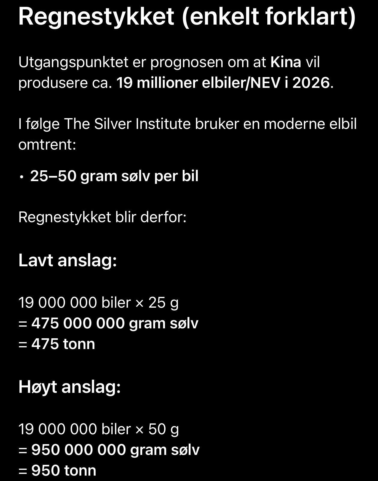 Et lite ChatGPT regnestykke om hva bare elbilproduksjonen trenger av sølv i 2026, hvor mye sølv har de lager for produksjon framover?