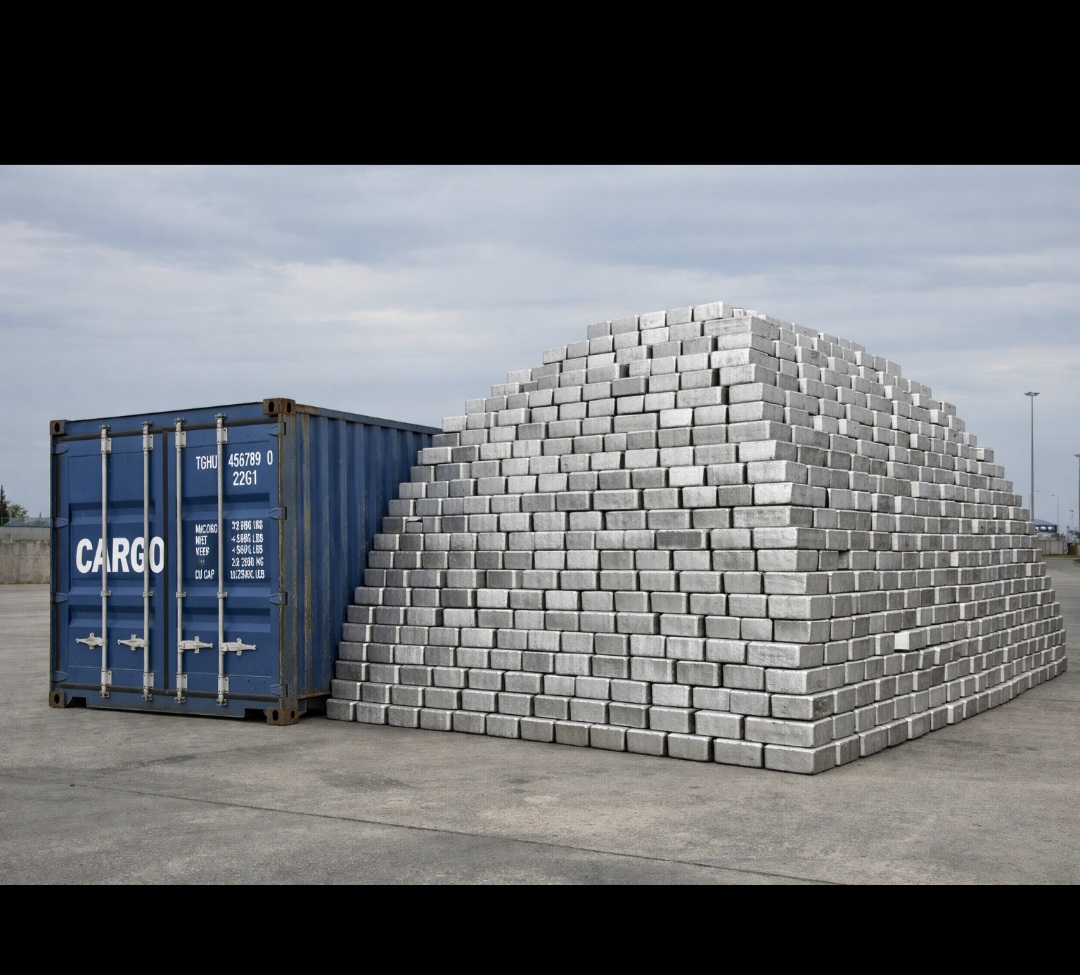 Slik ser 350 tonn sølv ut fysisk i mengde ved siden av en 20fots container. Bare chatGPT lage et bilde for å sammenligne