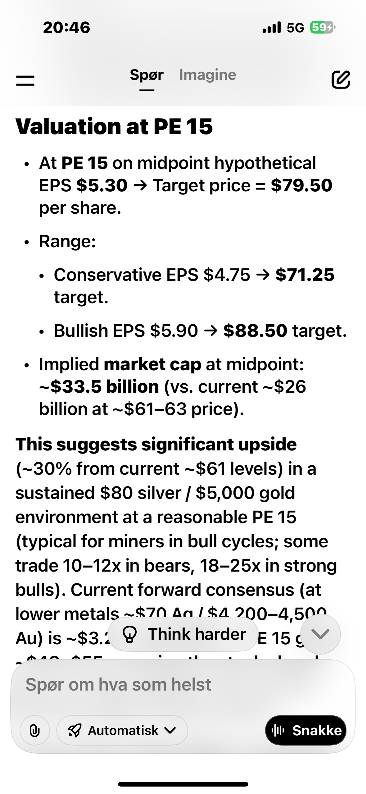 Noterer at AG som jeg ikke eier er nesten tilbake på ATH fra dagene da sølv var 120 dollar. Virker jo som om markedet nå mer og mer tror på at høye priser er kommet for å bli og dermed vil prise minerne mer opp enn de gjorde da prisen var 120. Samtidig ser vi at juniors + explorerne er langt unna ATH.