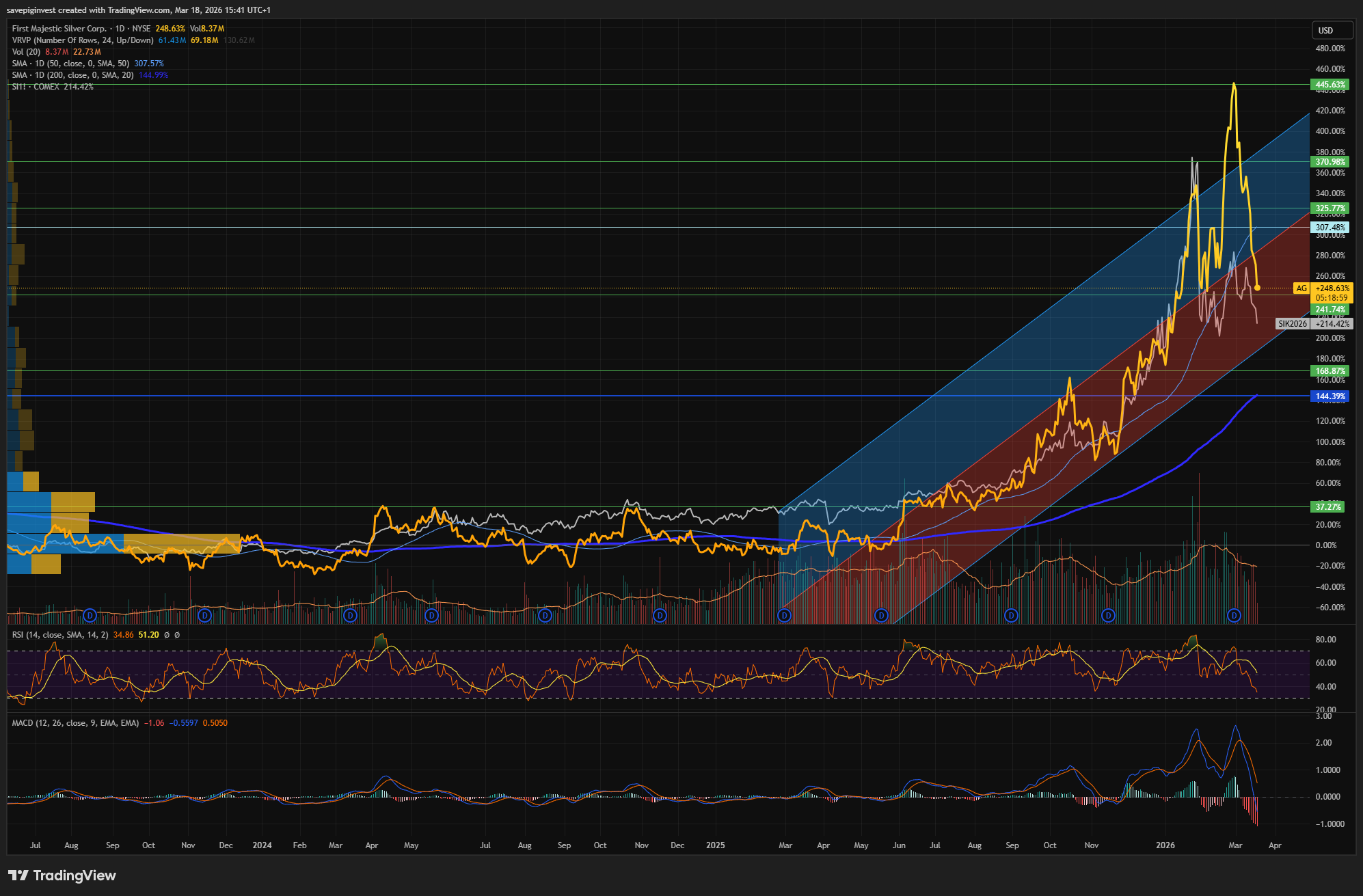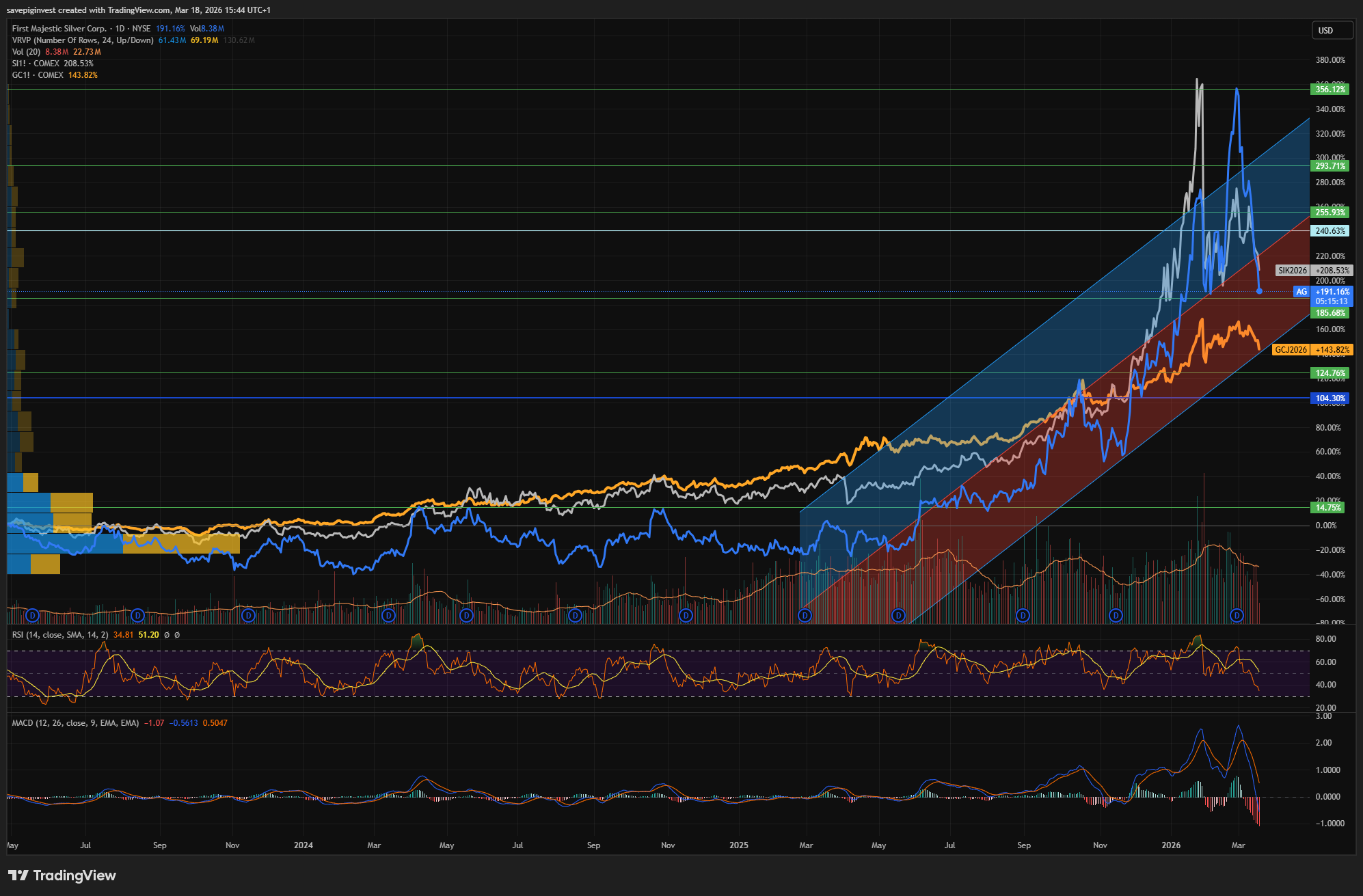 Legg sølvprisen som en grå strek over First mining som en gul strek, så er det jo fremdeles i samme ball park bare at miners blir som en giret shitcoin som virrer rund den og shitcoinen sølv er.