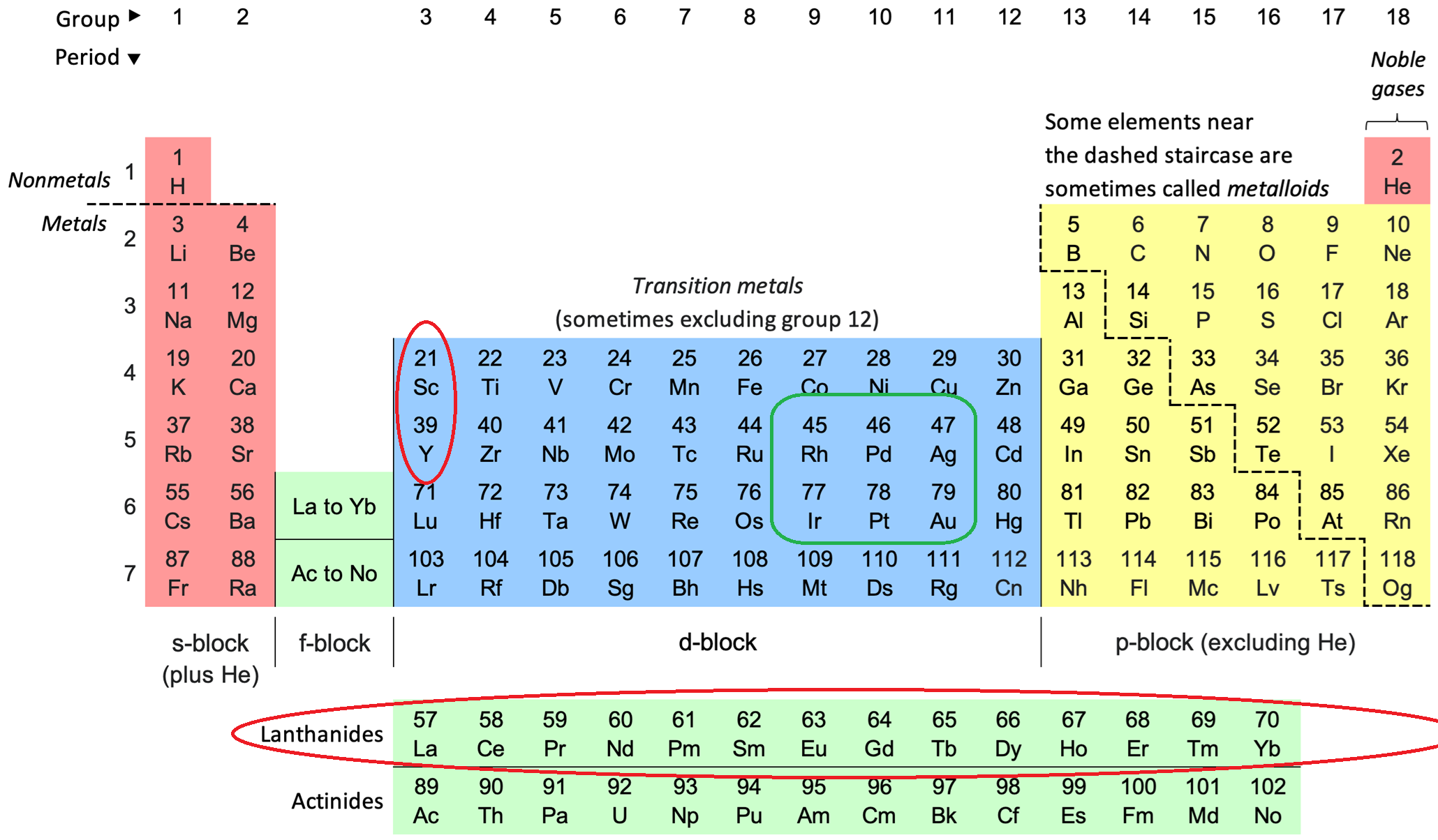 Relativt sjeldne edelmetaller markert i grønt, inkludert sølv.