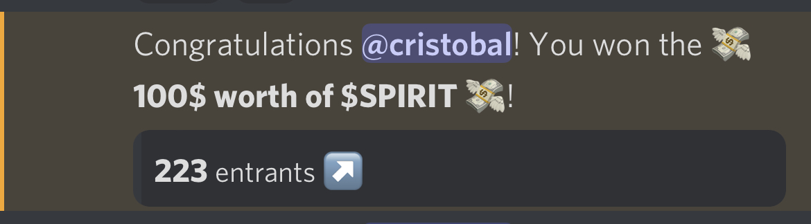 Vant 100$ i Spirit idag ikke mye men free Spirit, de har sånne raffles på Discord for dem som holder inSpirit