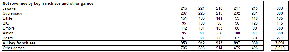 Interessant å se hvor stabile inntektene har vært i det som nå blir definert som “key franchises”. Av disse er det bare Bitlife som sliter. Er vel spillene fra Storm8 som har den største nedgangen i inntekter og ingen av de er nå definert som “key franchise”.