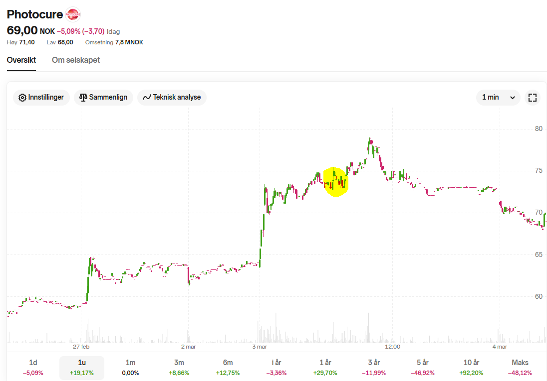 Men har kjøpt meg opp i nedturen fra forrige topp, så sitter tungt overvekt i den akkurat nå, tror 68 blir det nye 51 i photocure.
