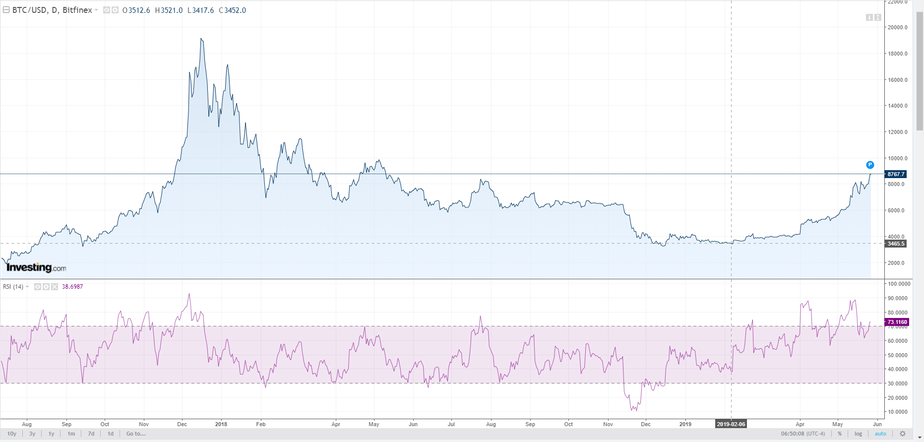 Kursen minner faktisk litt om Bitcoin. Sinnsykt stigning en periode, så en lang trend nedover, så plutselig drop på høyt volum (washout) før det så går videre oppover igjen…