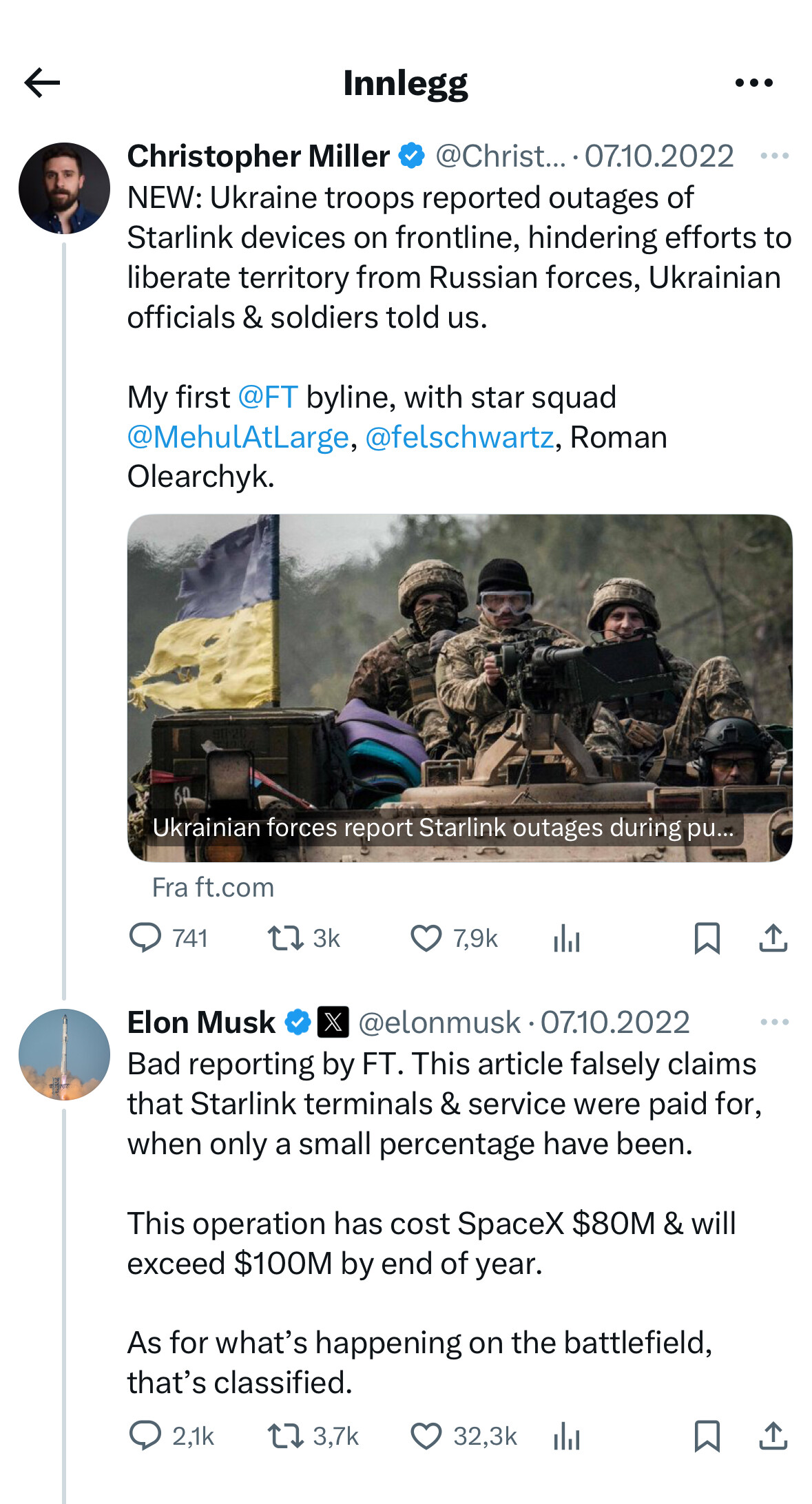 Artikkelen din har ingen navn fra SpaceX. Ingen kommentar fra Ukraina. Ingen kommentar fra Musk. Skrevet av Reuters. Og de kaller det en omfattende rapport… Republisert av en student i Finansavisen.