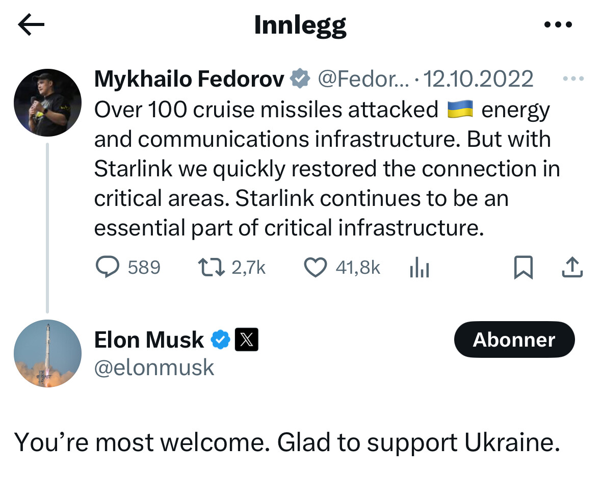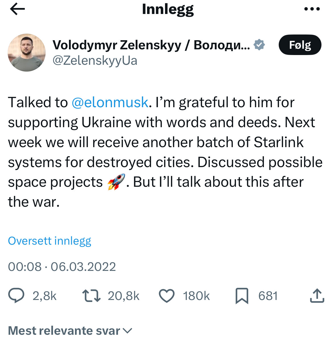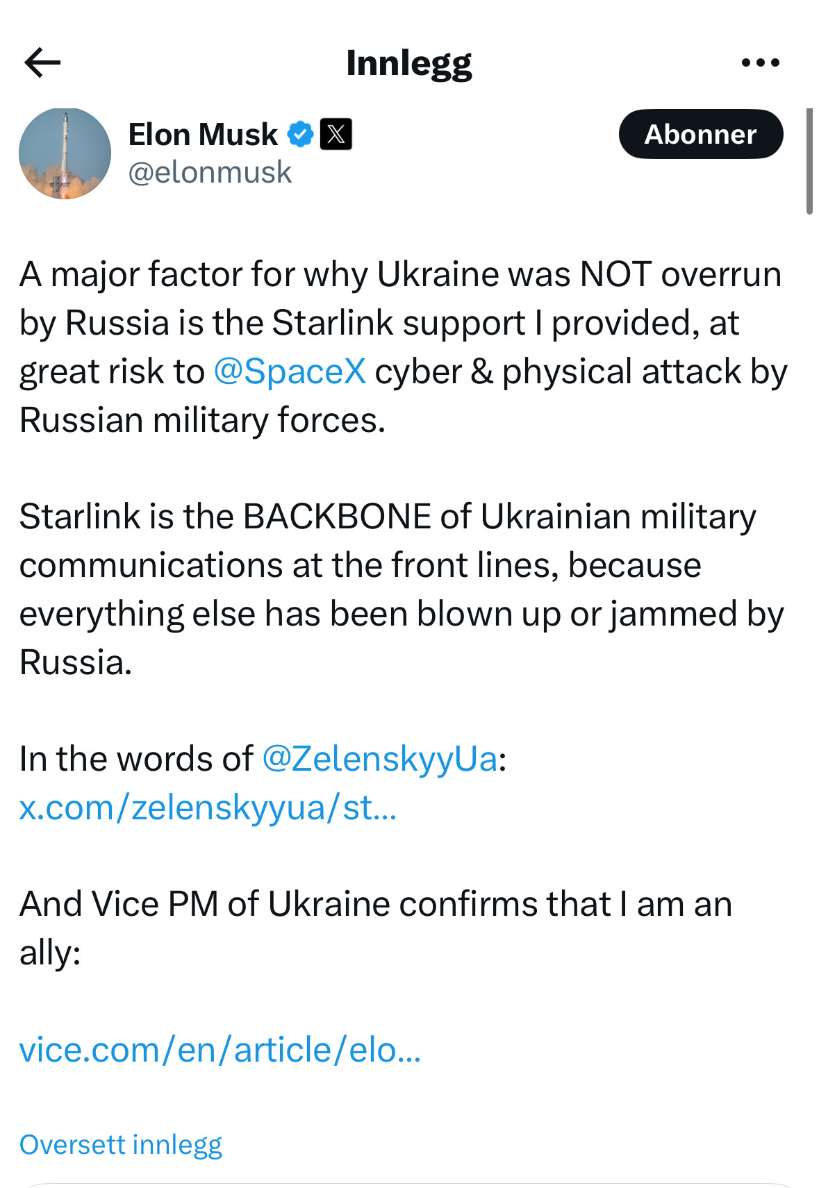 Å vise til innlegg på X hvor Zelensky smisker med Musk er jo kun et spill, såpass bør alle skjønne. Zelensky skryter også av Trump, men han vet inderlig godt at Trump soler seg i glansen av en krig hvor han kan klovne så mye han vil frem og tilbake. Både Trump og Musk er narsissister og altfor mange rundt de er puppets som bare jatter med.