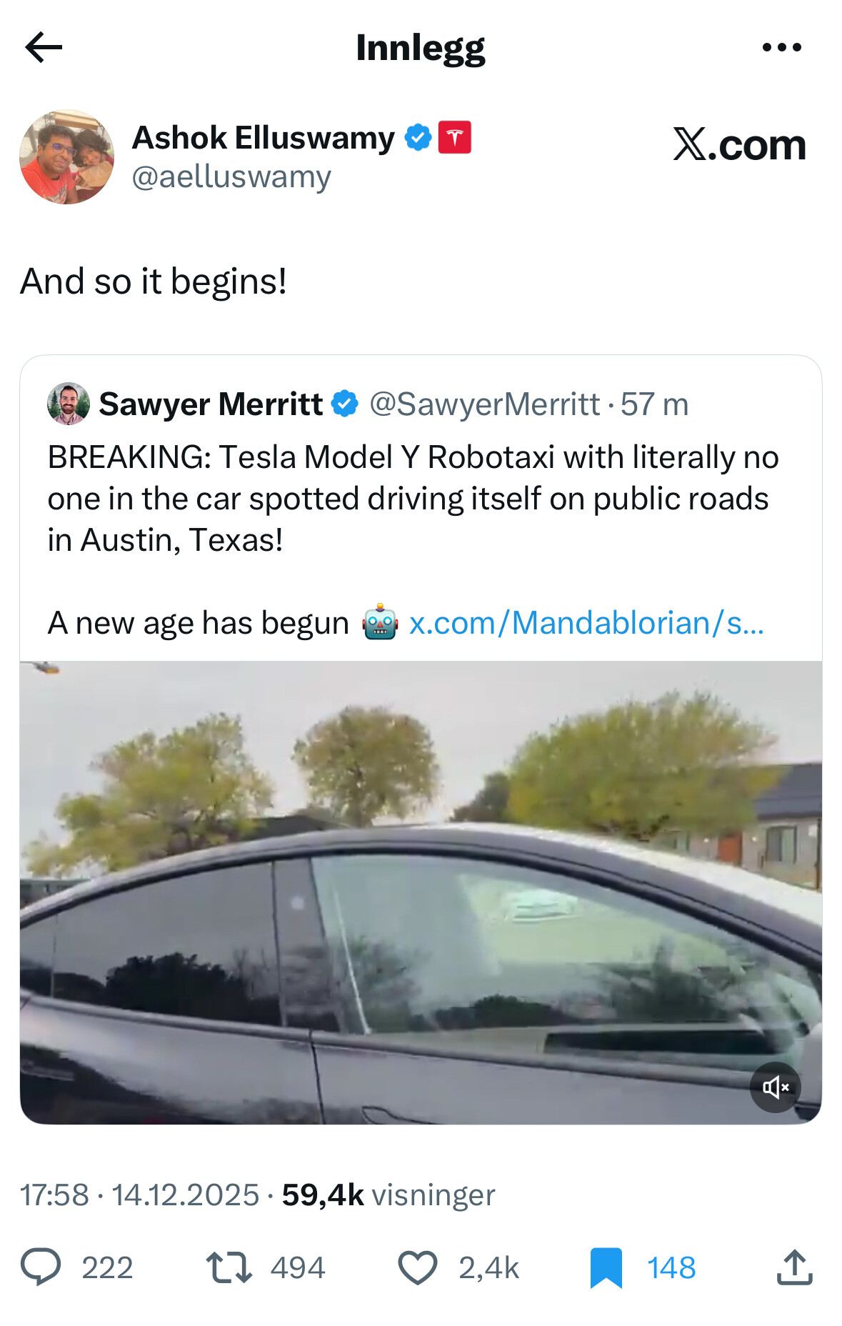 Det har jo liten hensikt Ä rulle ut en slik app nÄr det ikke finnes verken robotaxier eller tillatelser til Ä operere slike. Og sÄnn vil det vÊre i mange mange Är fremover. Teslas kamerabaserte opplegg kommer sannsynligvis aldri Ä bli godkjent for annet enn begrenset prÞvevirksomhet.