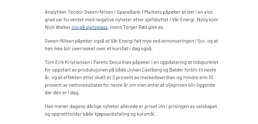 In connection with the proposed Offering, Nick Walker, the CEO of Vår Energi, has expressed his intention to purchase for his own account, and has provisionally been allocated, an amount of Shares equivalent to USD 1,000,000 in aggregate, which shall be determined with reference to the offer price at the completion of the accelerated book building process. The purchase and allocation is conditional on completion of the Offering.