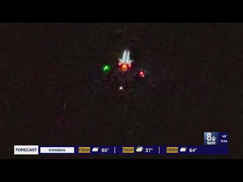 Innflyging til flyplass der man ser flere objekt hengende i luften med intenst lys, som ikke ser ut til å flytte på seg.