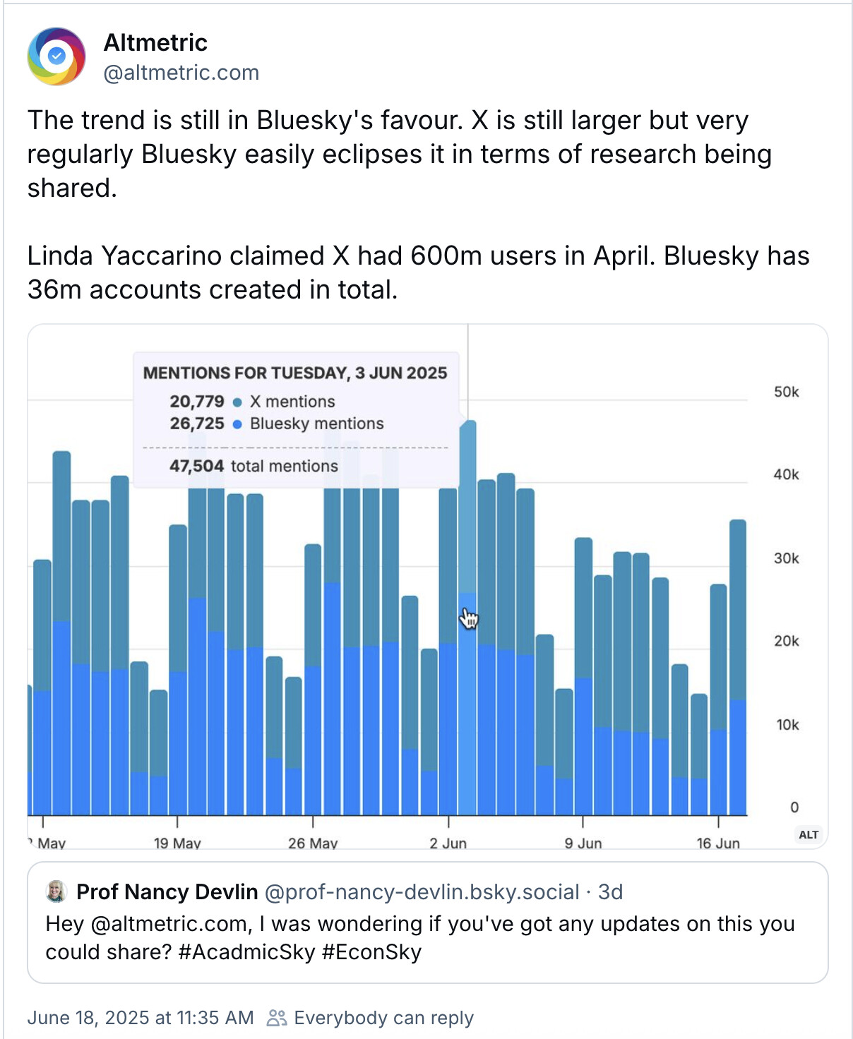 Altmetric er en tjeneste som sporer online engasjement til forskningsartikler, og du finner gjerne link til de på online-utgaven av de fleste vitenskapelige papers der du kan se hvor det blir delt, av hvem og hvilken demografi de hører til (members of public/Scientists). Totalt sett i antall poster så er det flere fra X, men med 600m brukere vs blueskys 35m kontoer så er bluesky brukerene helt klart mye mer aktive i forskningskomunikasjon.