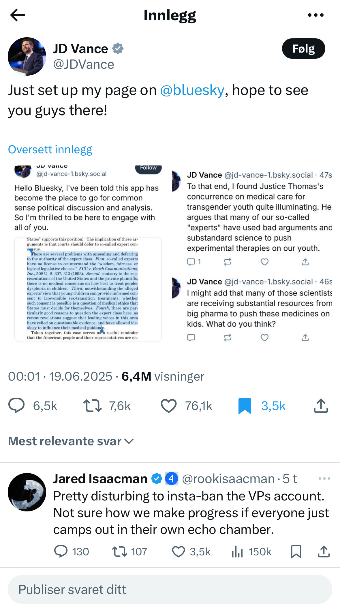Velkommen til Bluesky, JD Vance. Ikke følger jeg ham, og hvis han likevel blir slitsom er det gode verktøy for å både mute og blokkere. Nå som Bluesky lå på dødsleiet var det jo snilt av ham å strekke ut en hjelpende hånd.